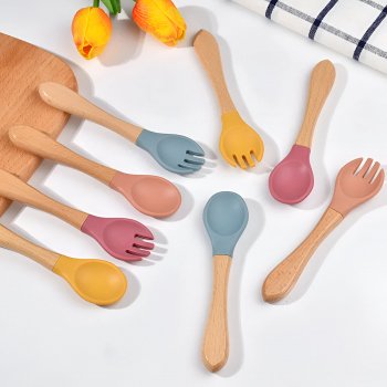 SoftGrip Silicone Baby Fork & Spoon Set with Wooden Handles